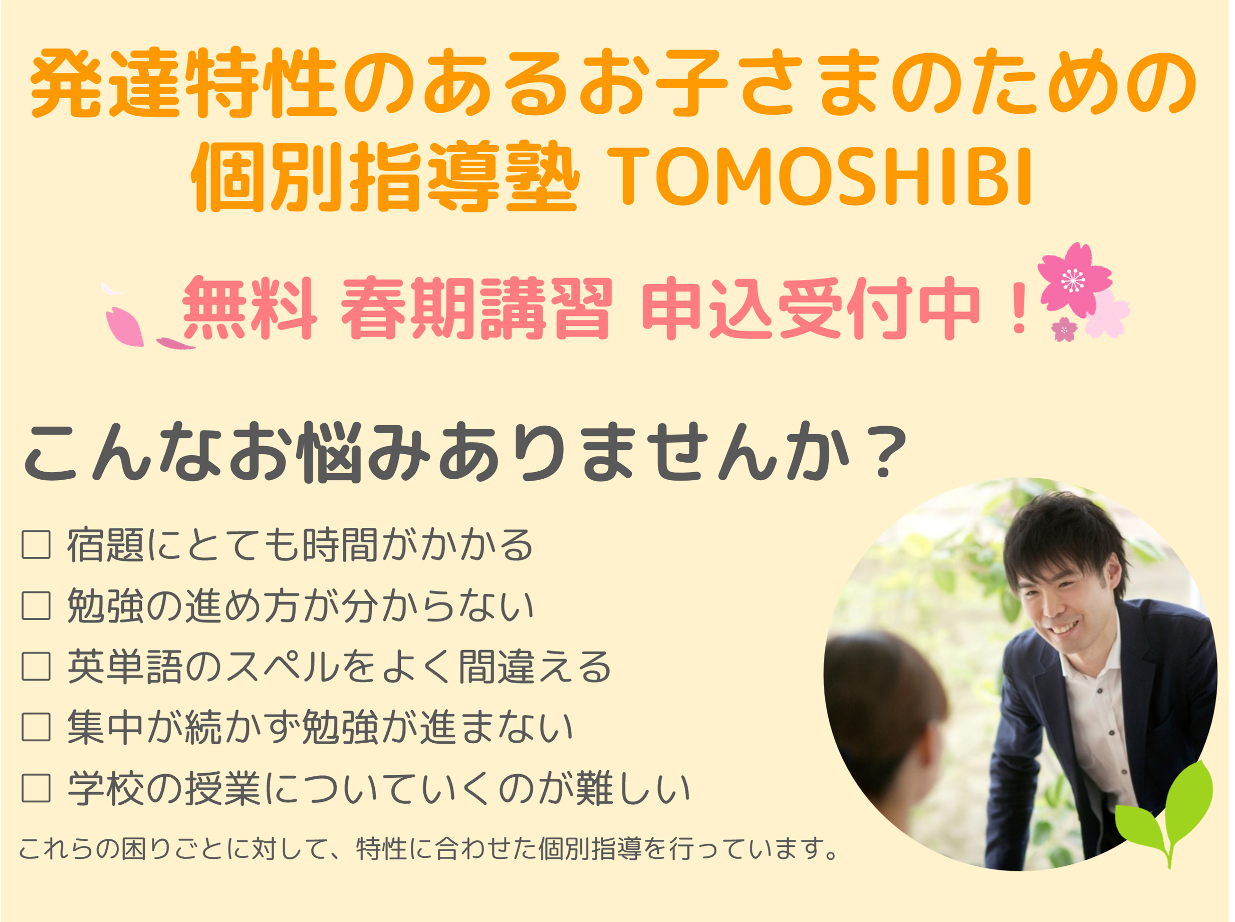 4月からの進級に不安はありませんか? TOMOSHIBIは発達に特性のあるお子さまや不登校中、不登校復帰間もないお子さまを対象とした個別指導塾です。現在、無料の春の体験会参加者を募集しています。新しい学年が始まる前に、お子さまに合った指導を受けて、笑顔で4月を迎えられるようにしましょう!