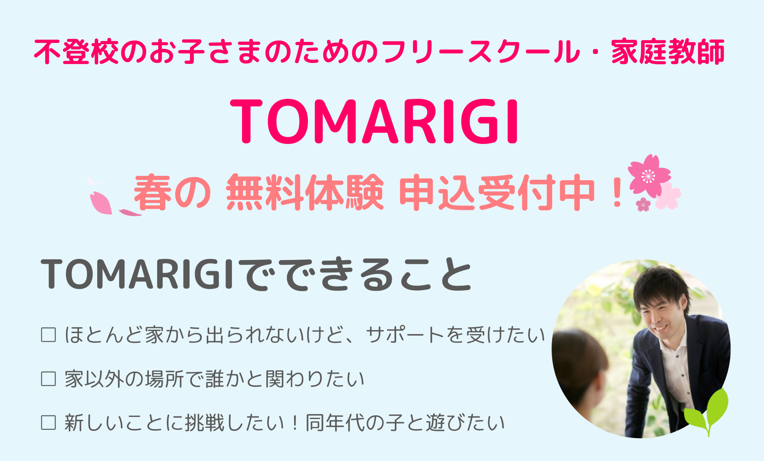 「お子さまとそのご家族の理解者として寄り添います。」 TOMARIGIでは、お子さまの状況やご家庭のご要望に合わせて、フリースクールや家庭教師など様々な支援をご用意しています。 発達に特性のあるお子さまの学習や生活面でお困りの場合も、指導経験のあるスタッフが対応いたしますのでご安心ください。現在、春の無料体験を受付中です。教室の雰囲気や支援内容を実際に体験していただける機会となっていますので、ぜひお気軽にご参加ください。